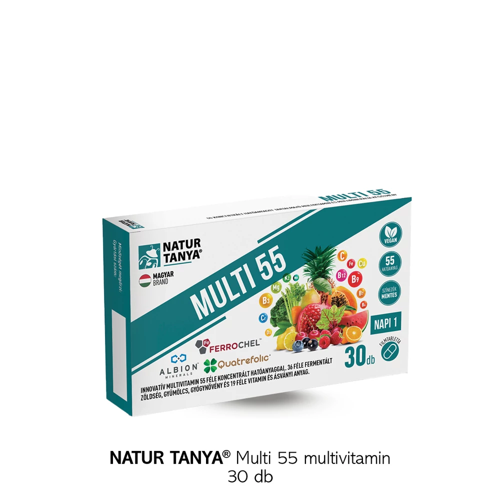 Azoknak, akik komplex megoldást keresnek immunrendszerük támogatására. A Natur Tanya® Multi 55 fermentált multivitamin 55 koncentrált hatóanyaggal: 36 féle zöldség, gyümölcs, gyógynövény és 19 féle vitamin és ásványi anyag. Vegán, glutén,- és laktózmentes, FÜGGETLEN, AKKREDITÁLT LABORBAN IS BEVIZSGÁLT ÉTREND-KIEGÉSZÍTŐ.