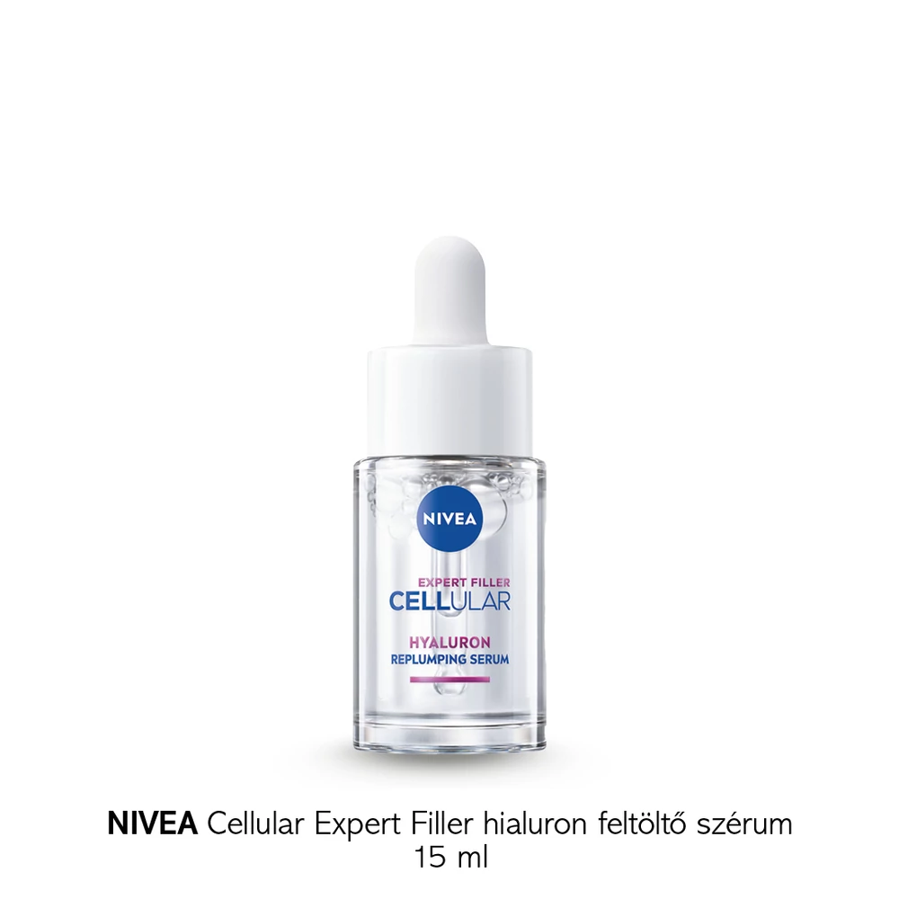 A NIVEA® CELLULAR EXPERT FILLER Hialuron Feltöltő Szérum egy hatékony ránctalanító megoldás a hidratált, puha, fiatalos kinézetű bőrért. A formula tiszta mikro hialuronsavat tartalmaz, mely egy erős hidratáló hatású molekula, mélyen bejut a bőrbe és hatékonyan feltölti a ráncokat.